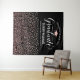 El elegante fondo de la fiesta de graduación para las fotos incluye una tapa de grado de color oro rosa, un "Graduado" en escritura, y un texto blanco personalizado moderno que se puede personalizar con el nombre del graduado y la escuela. Un patrón de Relieve metalizado de oro falso rosa cayendo en un confetti se viste de negro fondo - perfecto apoyo fiesta para que los clientes se paren delante para ver fotos con el jardín! Existen varios tamaños disponibles.