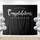 Telón de fondo extra grande para ceremonia de graduación o fiesta para las fotos de todos los graduados. El diseño es minimalista y presenta un diseño de escritura caligráfica "Felicitaciones" blanco moderno con un acento de gorra de graduado gris plateado sobre un fondo negro. Personalice el texto personalizado con el año de la clase y el nombre de la escuela.