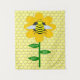 Esta increíble tapicería presenta una imagen gráfica de una linda abeja bumblebee amarilla con rayas negras, ojos, antenas y patas. Tiene alas azules y blancas bonitas. La abeja está sentada en el medio de un girasol amarillo dorado. La flor tiene un tallo verde y tres hojas. El mensaje "feliz día de la abeja" aparece repartido en las tres hojas. El fondo está compuesto por un patrón de panal de abeja amarillo.