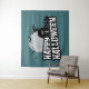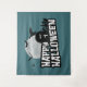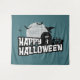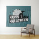 Feliz ilustracion de diseño de texto de Halloween con decoración de cementerios y murciélagos en luna llena sobre fondo azul
