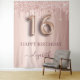 Un tapiz para una fiesta de Sweet 16 femenina y glamurosa, fiesta de cumpleaños número 16. Un fondo degradado rosa con dorado rosado y gotas de brillo falso de color dorado rosado elegante con un efecto de pintura que gotea. Con el texto: Feliz Cumpleaños. Personaliza y agrega un nombre. El nombre está escrito en dorado rosado oscuro con un estilo de letra manuscrita moderna con florituras. El número 16 está escrito con una fuente de estilo globo trendy. Para mantener las florituras, solo elimina el nombre de muestra, deja los espacios o emojis delante y detrás del nombre. Puede ser utilizado como pancarta de bienvenida, decoración de pared para la fiesta o como fondo para cabina de fotos.