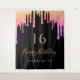 Una alfombra de cumpleaños número 16 de Sweet 16 (o cualquier edad) moderna y glamurosa. Un fondo negro clásico decorado con gotas de brillo falso de colores arcoíris, aspecto de pintura goteante en morado, rosa y dorado rosa. Con el texto: 16 Feliz Cumpleaños. Personaliza y añade un nombre. Texto de color dorado.