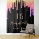 Un tapiz de 16, 16 años (o andy) de moda y glamuroso. Un fondo negro clásico decorado con goteos en purpurina en color arcoiris, pinturas en color violeta, rosa y oro rosa. Con el texto: 16 Feliz cumpleaños. Personalice y agregue un nombre. Texto dorado. Se puede utilizar como una pancarta de bienvenida, como el telón de fondo de la cabina de fotos y como decoración de paredes fiestas.