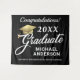 Telón de Fiesta de Graduación. Aspecto de lámina dorada falsa con gorra de birrete con letras de escritura al estilo de la universidad. Totalmente personalizable: agregue fácilmente su propio texto, cambie el color de fondo, el tamaño y el estilo del texto. Entorno de fondo elegante pero tradicional para la celebración de su graduado.