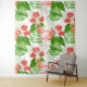 Diseño acuático con flores y pájaros flamencos, monstera y hojas de palma.