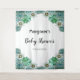 Una elegante tapicería para una Baby Shower. Decorada con plantas suculentas, cactus, flores de cactus sobre un fondo blanco elegante. Flores en plata, verde y gris. Plantillas para el nombre de la futura mamá y la fecha de la ducha, letras negras y grises.
