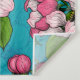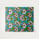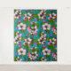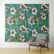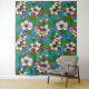 Flores de manzana dibujadas a mano y abejas con un fondo turquesa