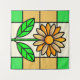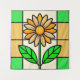 un ilustracion de cristal de una margarita amarilla y blanca con hojas verdes.