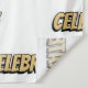 Fondo blanco de fotografía con patrón de celebración de cómic. Un patrón de tipografía al estilo de los cómics Celebra en dorado sobre un fondo blanco para algunas divertidas fotos tipo cabina para que tú y tus invitados se tomen delante en tu boda.