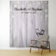 Plantillas de fondo para cabina de fotos de boda - Letra elegante, copas de champán vintage y luces de cuerda sobre fondo de madera rústica.