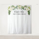 Un divertido telón de fondo para que los invitados de su ducha se hagan fotos. Con flores blancas y vegetación. Personalice con su texto.