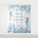 Crea un impacto en tu baby shower con este telón de fondo para selfies con tema bajo el mar, que presenta obra de arte original de acuarela de un caballito de mar y coral en tonos suaves de azul. Diseñado especialmente para un bebé varón, este telón de fondo adorable y personalizable añade un toque mágico a tu celebración.