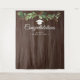 Un hermoso fondo de fotos para agregar algo extra a tu fiesta de graduación. Este diseño presenta un arreglo de eucalipto verde acuarela sobre una madera oscura pintada y un gorro de graduación blanco y dorado debajo. "Felicidades" está en letra cursiva blanca y tu nombre y clase/fecha también están en letra sans serif blanca.