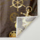 Fondo de madera marrón con mar, cresta mecánica, volante antiguo, ancla dorada y varios engranajes de oro y latón. Estilo Steampunk.