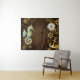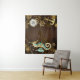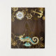 Fondo de madera marrón con mar, cresta mecánica, volante antiguo, ancla dorada y varios engranajes de oro y latón. Estilo Steampunk.