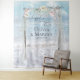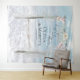 Coloque a sus invitados en la playa para una sesión de fotos con este tapiz de fondo de boda (o como telón de fondo coordinado para sus votos de boda, libro de invitados o mesa de la fiesta de boda) - 'Felices para siempre' escrito en caligrafía moderna con los nombres de los novios y la fecha de la boda en texto de estilo contemporáneo moderno. Elegante enramada de playa junto al mar hecha de madera flotante y cortinas de tul transparente decoradas con flores de magnolia pálidas y vides colocadas en una playa de arena con olas de agua blanca. Detrás hay un hermoso cielo azul con nubes esponjosas. Obra de arte original creada para BarefootBride ™ por © WhimsicalArtwork ™ - Esta es parte de un conjunto completo de papelería de boda con papelería de boda, baby shower y otros eventos coinc