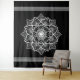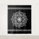 Elegante diseño de círculo de mandala floral blanca ornamentada con acentos de rayas blancas y fondo negro cambiable.