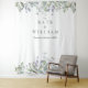 Fondo de cabina de fotos de boda con flores de acuarela de follaje verde salvia y lila con hermosas hojas de salvia y lila y los detalles de su boda en texto clásico elegante. Diseñado por Thisisnotme©