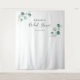 Elegante fondo para cabina de fotos de despedida de soltera con un diseño simple que presenta vegetación de eucalipto verde menta pintada con acuarela junto con el nombre de la novia y la fecha. Este fondo para cabina de fotos botánico rústico con un toque moderno es perfecto para una despedida de soltera en primavera o verano.
