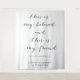 Un hermoso elemento decorativo perfecto como fondo para su ceremonia, que incluye el popular versículo bíblico "éste es mi amado, y éste es mi amigo" Salomón 5:16 en fuente de estilo caligráfico moderno negro, con la referencia debajo en fuente serif pequeña. Personalice con sus nombres y fecha de boda. Utilice como decoración en su hogar después de la boda.