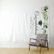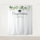 Un hermoso fondo para fotos para agregar algo extra a tu fiesta de graduación. Este diseño presenta un arreglo de eucalipto acuarela verde sobre un fondo blanco, y un gorro de graduación negro y dorado debajo. "Felicidades" está en fuente cursiva negra y tu nombre y fecha de graduación también están en fuente sans serif negra.