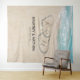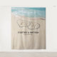 Tapiz de accesorio de foto de destino de playa con un fondo de isla oceánica tropical de verano, una playa de arena vintage con dos corazones en la orilla, sus iniciales, nombre y fecha de la boda.