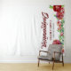 Fondo personalizado para fotos para la fiesta de recepción de tu Quinceañera. Las hermosas rosas rojas con hojas besadas por el sol proporcionan un elegante fondo para tus fotografías de recuerdo. Este diseño floral de acuarela se encuentra en la parte superior del colgante de pared, enmarcando tu nombre y la fecha de tu celebración. Quinceañera está escrito en caligrafía ornamentada en un color burdeos rojo oscuro para combinar con tu nombre. Por favor, explore nuestra Colección de Rosas Rojas Vintage para encontrar invitaciones y suministros para fiestas de Quinceañera que coordinen.
