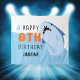 Fondo de cumpleaños de tiburón para niños. Letrero de cumpleaños número 8 en azul y naranja para decoraciones de cumpleaños de niños o niñas de ocho años.