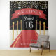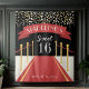 Crea una atmósfera de glamour de Hollywood en tu celebración de cumpleaños dieciséis con este telón de fondo fotográfico personalizado que cuenta con una alfombra roja y una cuerda de terciopelo. El nombre del invitado de honor se muestra en una marquesina roja con "cumpleaños dieciséis" debajo en blanco.