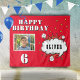 Tapiz de fondo fotográfico del partido de cumpleaños de Superhéroe Comic Speech Cloud Boy. Banner de cumpleaños de superhéroes rojos divertidos para los chicos. Añade tu foto, nombre y edad.
