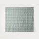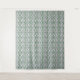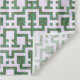 Un patrón geométrico complejo llena el espacio, con formas verdes y blancas entrelazadas que crean un diseño simétrico repetido. Con un diseño visualmente complejo, el patrón evoca un sentido de orden y estructura.