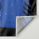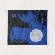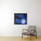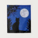 Tapiz en una silueta de un gato, mirando a una luna llena en un cielo estrellado azul profundo