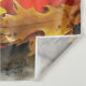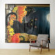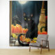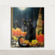 Un gato negro se sienta en una puerta con calabazas, linterna, palo de labranza, hojas de otoño y una luna llena de cosecha detrás.