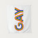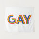Esta obra de arte muestra la palabra gay en una colorida fuente arcoiris.