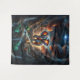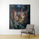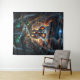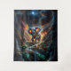 Una escena surrealista y fantástica con un elefante de colores vivos en medio de un paisaje rocoso y montañoso. El elefante está adornado con motivos intrincados y agitados en tonos azules, naranjas y rojos, lo que le confiere un aspecto diferente al mundo. El fondo resalta los cielos dramáticos y llenos de nubes con un elemento cósmico, ya que un cielo estrellado por la noche es visible por encima.
