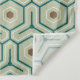 Geometric pattern with interlocking hexagons in green and teal, featuring brown hexagons in the center. The design is symmetrical and retro-inspired.