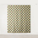 Geometric pattern with overlapping half-circles in teal, cream, brown, and peach on an orange background, creating a vibrant and retro feel.