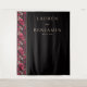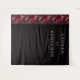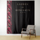 This wedding backdrop features a striking vertical layout with a bold contrast between a black background and an ornate side panel adorned with stylized skulls and floral elements in deep reds, pinks, and creams. The design blends gothic and romantic themes, creating a sophisticated and intriguing atmosphere perfect for a memorable celebration. Elegant typography highlights the names and date, adding a touch of formality to the overall aesthetic. Ideal for couples seeking a unique and dramatic setting, this backdrop combines detailed illustration with minimalist text placement for a visually captivating experience.