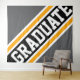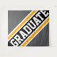 Este diseño deportivo presenta texto GRADUATE atlético dentro de resaltadas rayas diagonales anchas negras, blancas y amarillas doradas contra un fondo gris audaz. La primera y última letra de la palabra "graduate" se salen de los bordes del diseño con un efecto de banner dinámico. Los colores y el texto en este diseño se pueden personalizar.
