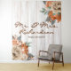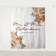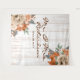 Tablas de madera rústica de granero blanco de fondo, con un precioso ramo de flores en florales de color naranja quemado y crema con elementos botánicos polvorientos de color verde en las esquinas superior derecha e inferior izquierda, tipografía de letra cursiva elegante para el nombre personalizado de la familia Sr. y Sra.; combinada con tipografía serif para fecha personalizable. Es un diseño atemporal hecho específicamente para una boda rústica o celebración de aniversario.
