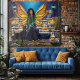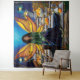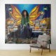 Un hada con alas naranja y amarillas sentada sobre escalones de piedra que conducen quizás al reino de los hados. La hada afroamericana no está sola, está con su perro guardián doberman este día de otoño.