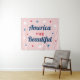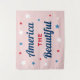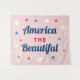 Diseño de señal de tapiz de fondo de foto de fiesta de vacaciones patrióticas elegante del 4 de julio con características de diseño de texto de tipografía de cita "América la hermosa" en colores rojo, blanco, azul y azul marino con acentos de estrellas y color de fondo rosa claro.