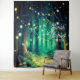 Una hermosa tarde para una boda, con un camino forestal adornado con luces de hadas en los árboles que crean un impresionante fondo. Una suave niebla permanece en el fondo del bosque, con innumerables árboles y luces colgando elegantemente de sus ramas.