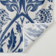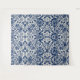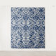 Intricate blue floral pattern on a light background, featuring stylized blooms and curling leaves, evoking a vintage, elegant feel.
