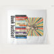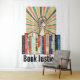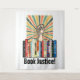 Protesta prohibiendo libros con esta imagen que muestra una estantería de libros prohibidos, un puño levantado en protesta, un estallido de rayos de color y las palabras "Justicia del libro" en un tipo de letra retro. Acentuado por un borde de azul rico. ¡Parece genial!