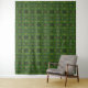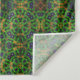 Los patrones geométricos intrincados se tejen a través de un fondo verde, creando un diseño simétrico y repetitivo. Los colores dominantes son el verde y el amarillo, con pequeños acentos de color morado y azul.