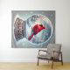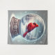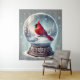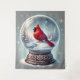 Un cardenal rojo vibrante encaramado dentro de un globo de nieve ornamentado, rodeado por un paisaje de invierno helado con árboles nevados y delicados copos de nieve.