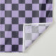 A vibrant checkered pattern with alternating black and lavender squares creates a bold, symmetrical grid. The design is balanced and visually striking.