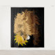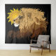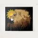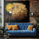 Retrato de perfil de un león con arte tribal. un sol amarillo de mandala se sienta detrás del león con un fondo negro.