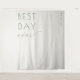 This elegant wedding backdrop features a minimalist design with the heartfelt phrase "Best Day Ever" in a sophisticated, cursive typography. The soft color palette and clean lines create a timeless and romantic atmosphere perfect for capturing special moments on your big day. With its understated charm, this backdrop is ideal for couples seeking an intimate yet stylish setting to celebrate their love.
